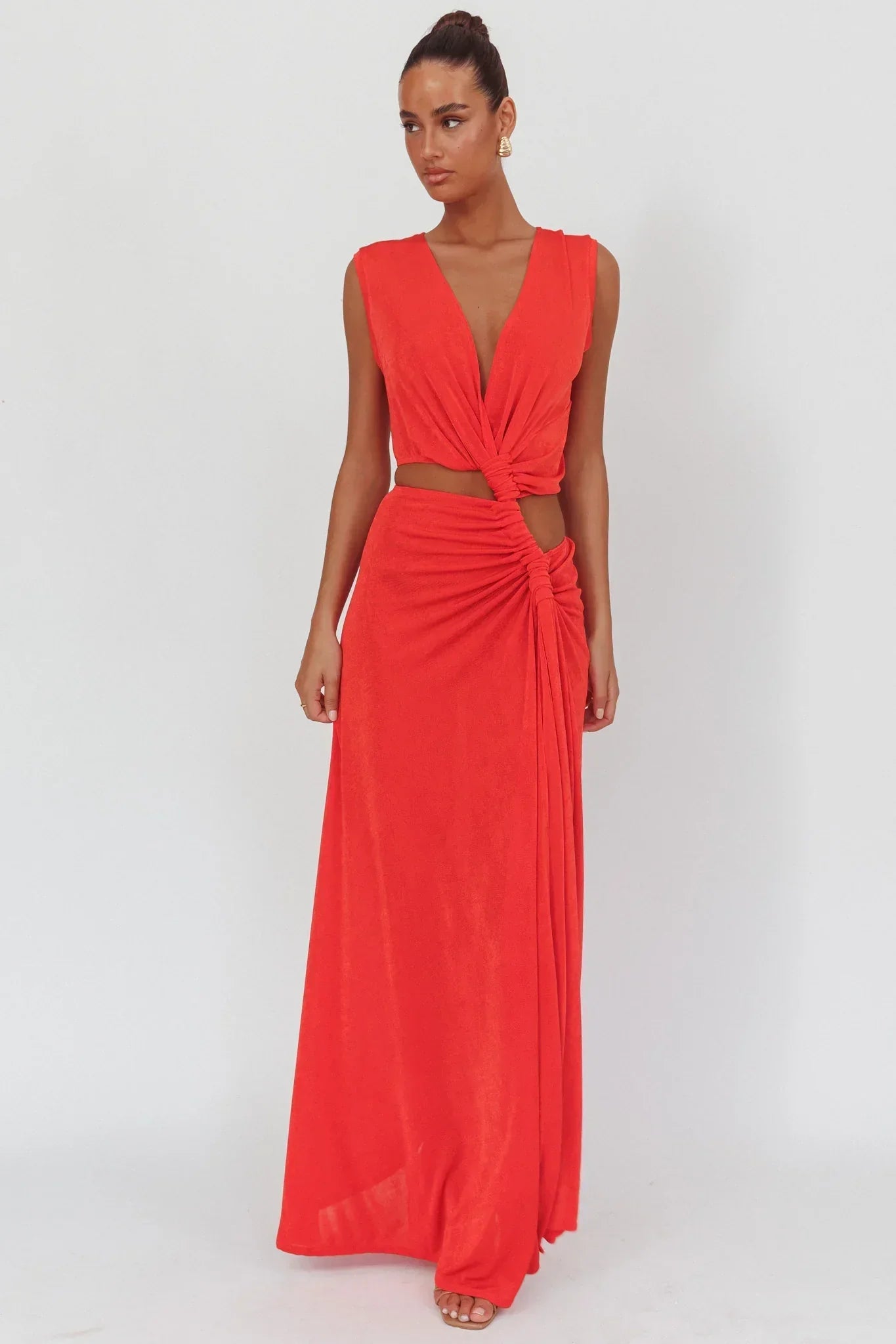 A stunning coral maxi dress featuring a beautiful twist accent and a subtle cut-out at the waist, perfect for making a statement at any special event. Crafted from stretchy jersey fabric for a comfortable and flattering fit. Soft, romantic, making you beautiful and confident—designed just for you.