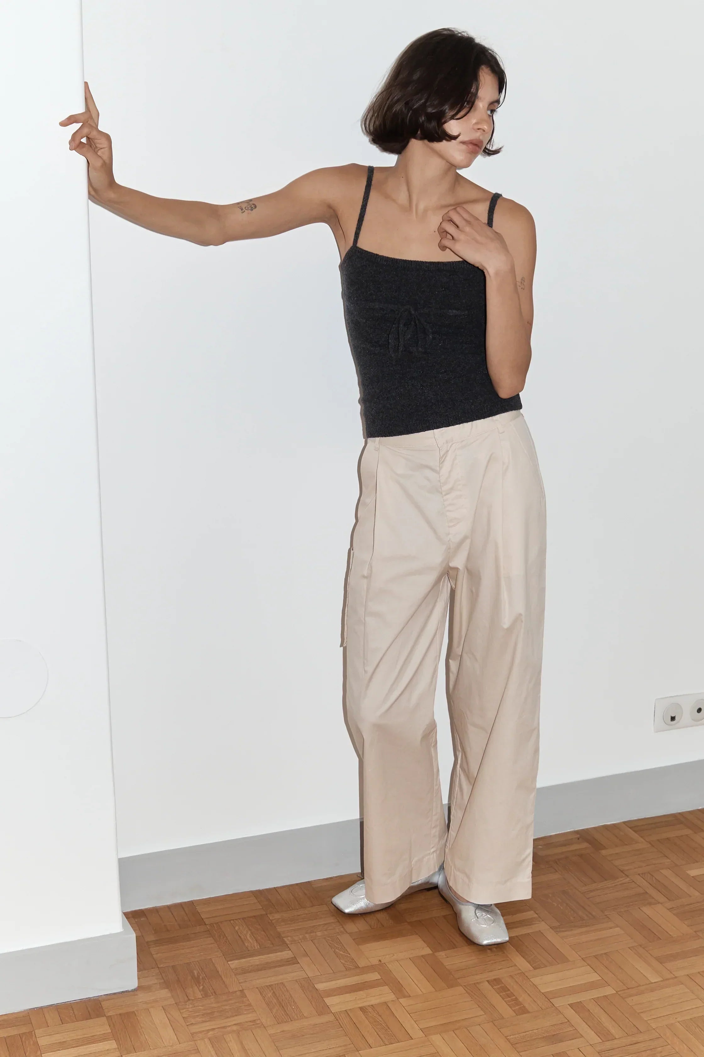 A wide leg trouser pant designed with a mid rise and a unique gathered pocket feature on one side. It includes deep front pockets, back pockets, a zip fly with slider closure, and belt loops for a complete and polished look.
