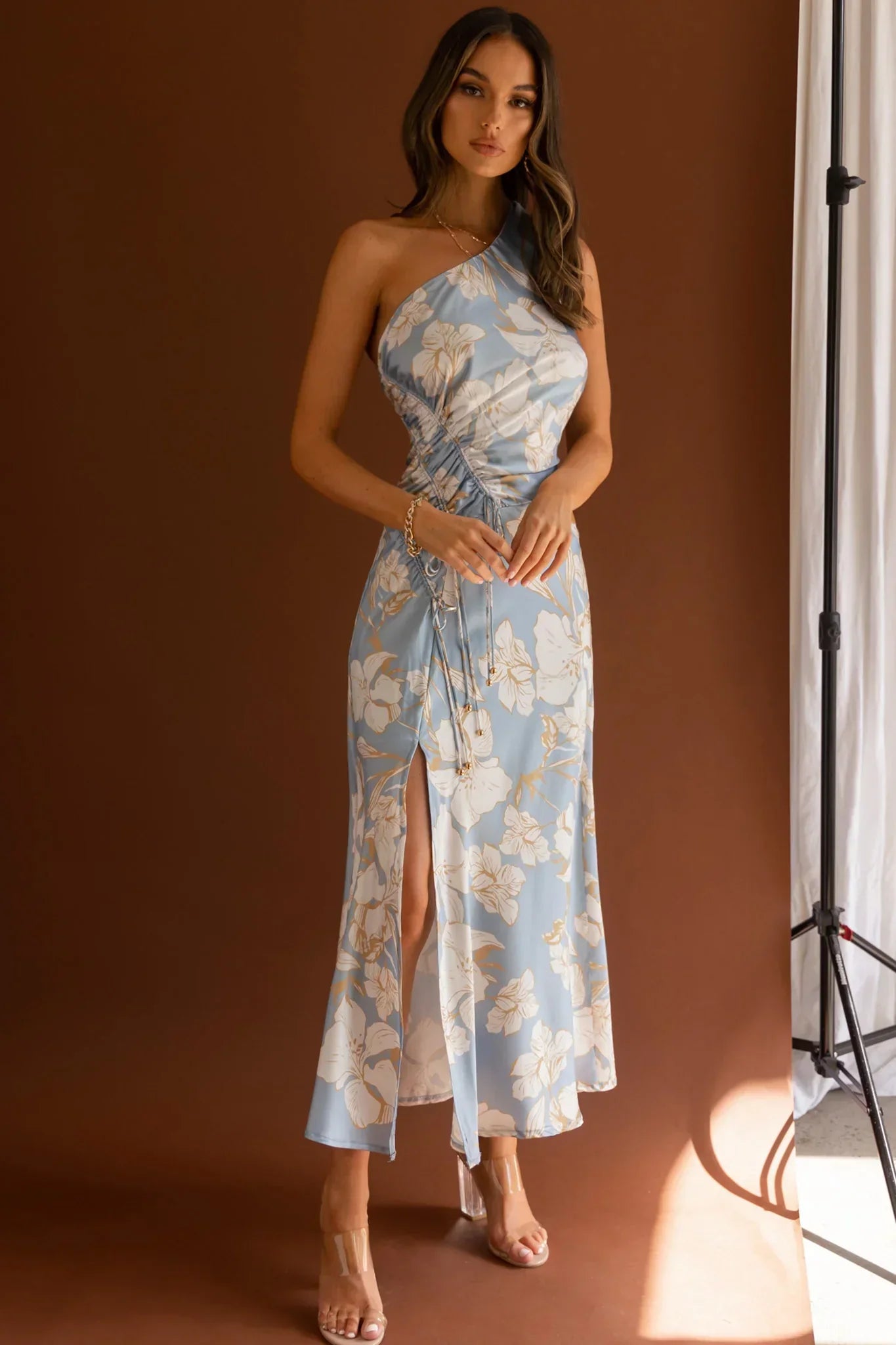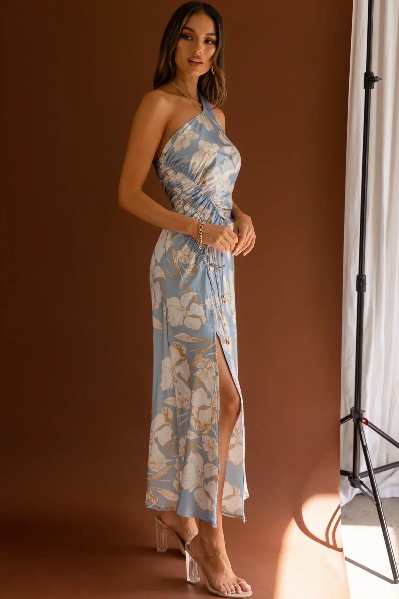 A captivating blue floral midi dress designed to turn heads. The one-shoulder style and drawstring ruching at the waist create a beautifully flattering silhouette, perfect for romantic evenings or special occasions.