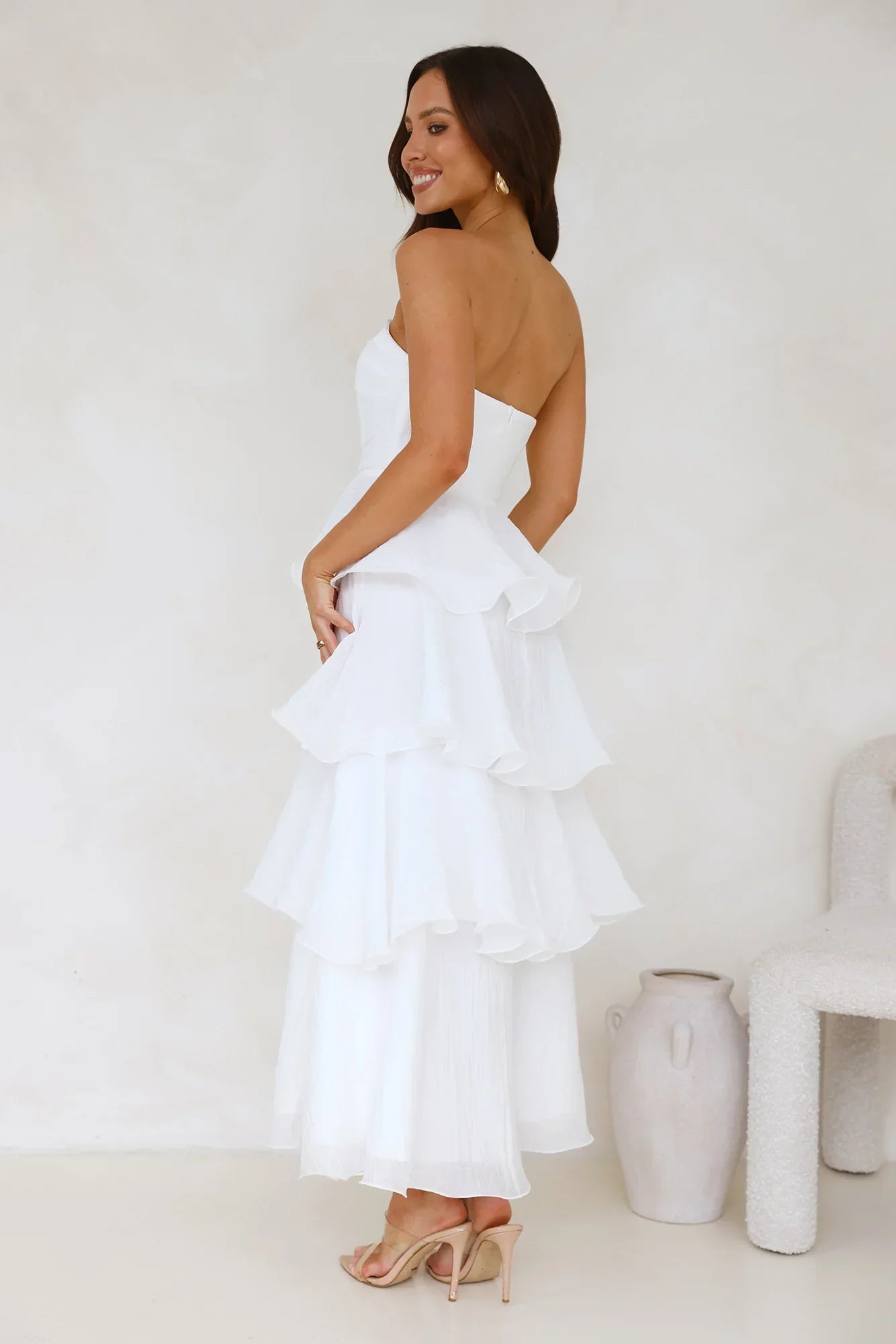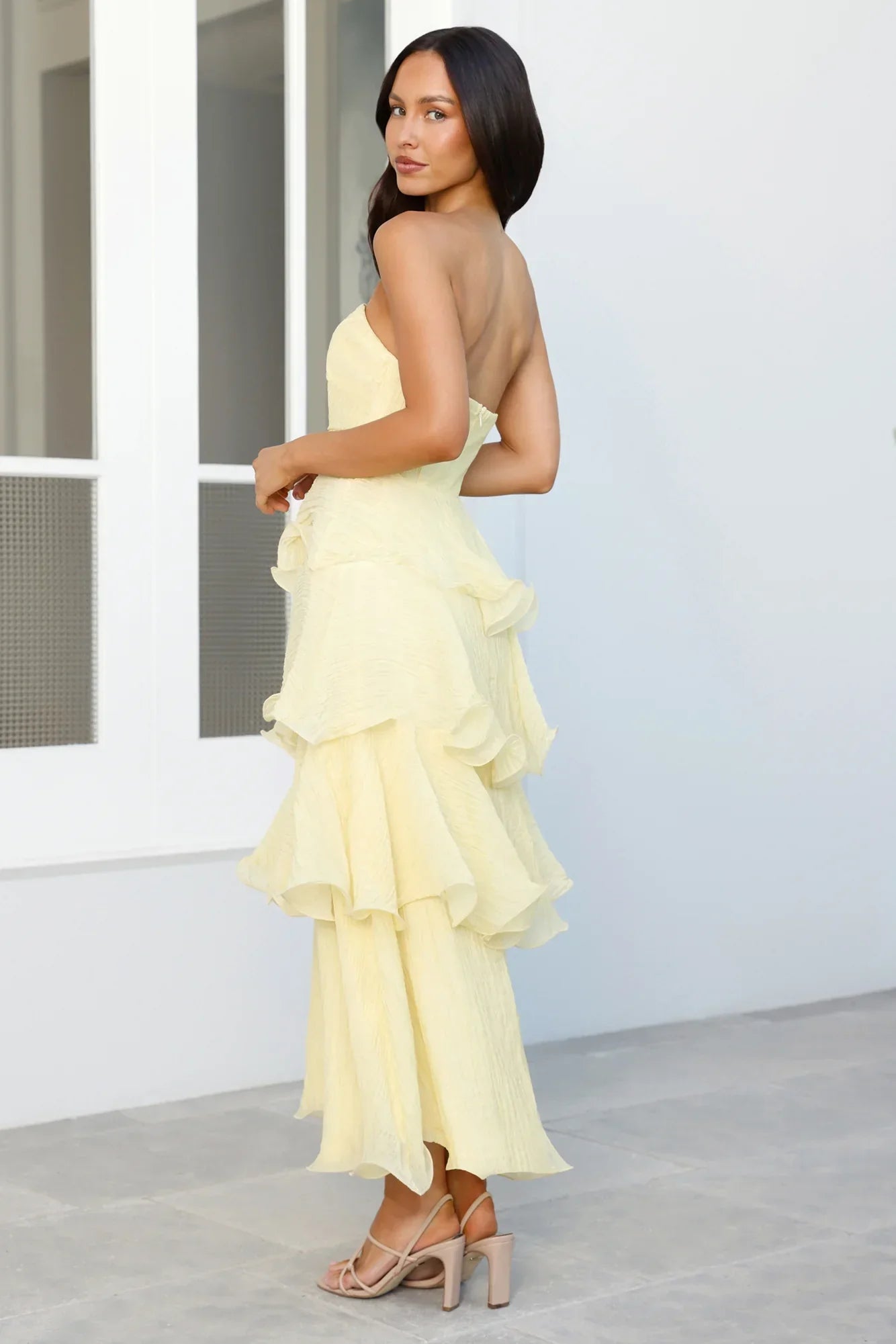 An extravagant gown designed for a memorable celebration, featuring a tiered frill skirt and a gathered top with structured boning for a flawless silhouette.