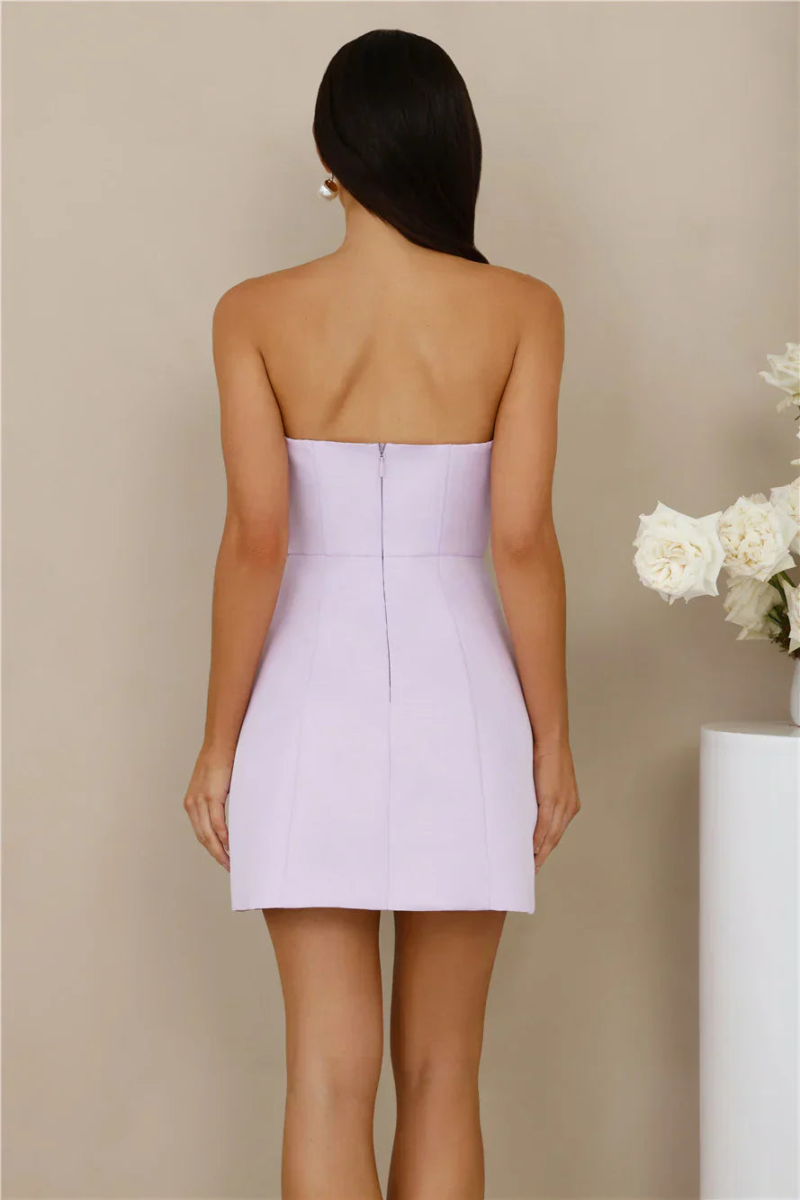 A dreamy strapless mini dress featuring a flared silhouette that moves with you. Delicate tulle rosettes and structured boning create a romantic, eye-catching look perfect for special moments.