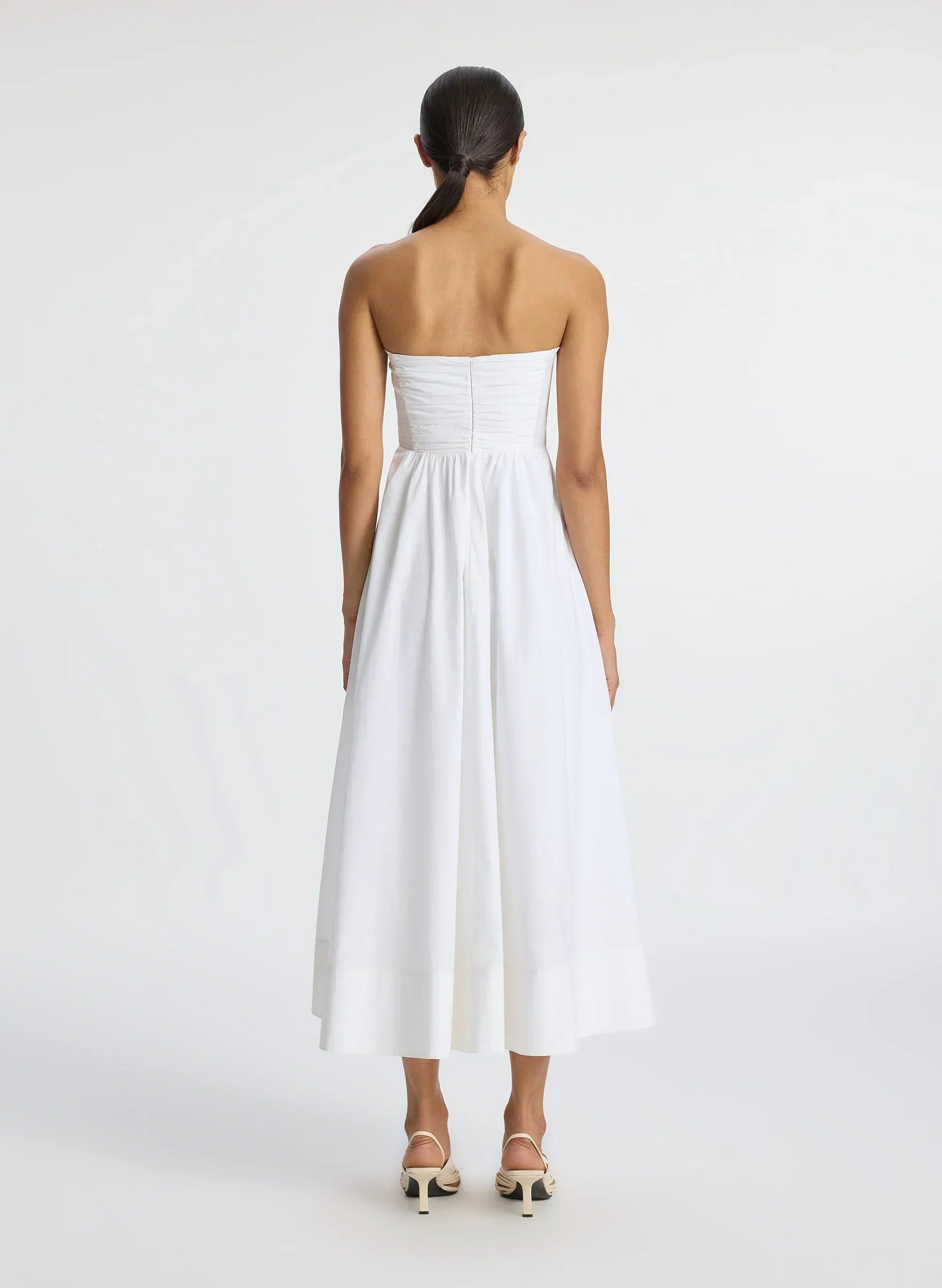 Crafted from easy day cotton in timeless white, this strapless silhouette features beautiful pleating and gathering with smocking at the sides. The full midi skirt flows gracefully, complete with convenient pockets and a gum-lined bodice for a secure, elegant fit.