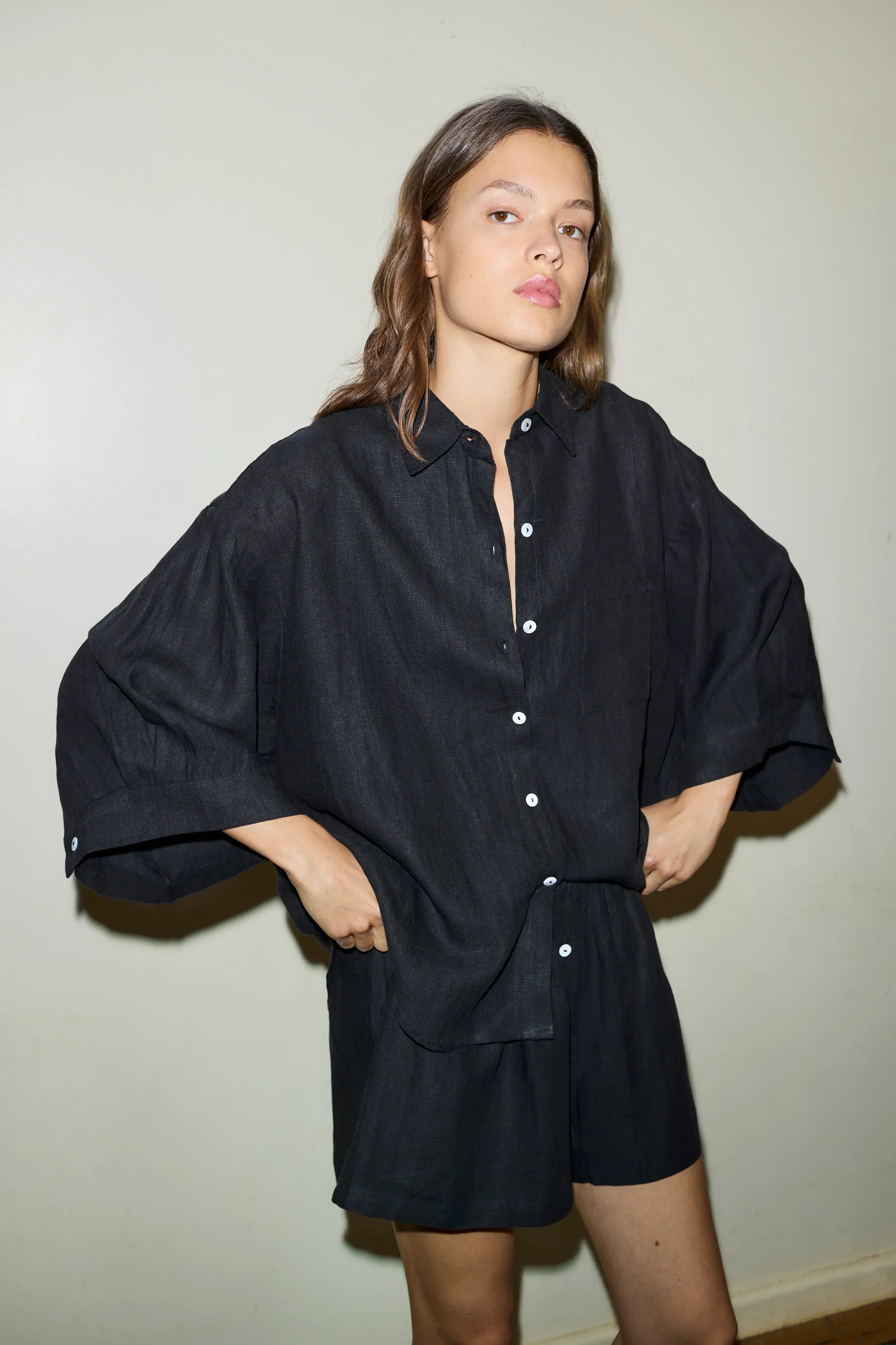An oversized linen shirt with wide arms and a front pocket, paired with loose-fitting boxer shorts featuring an elastic waist for all-day comfort.