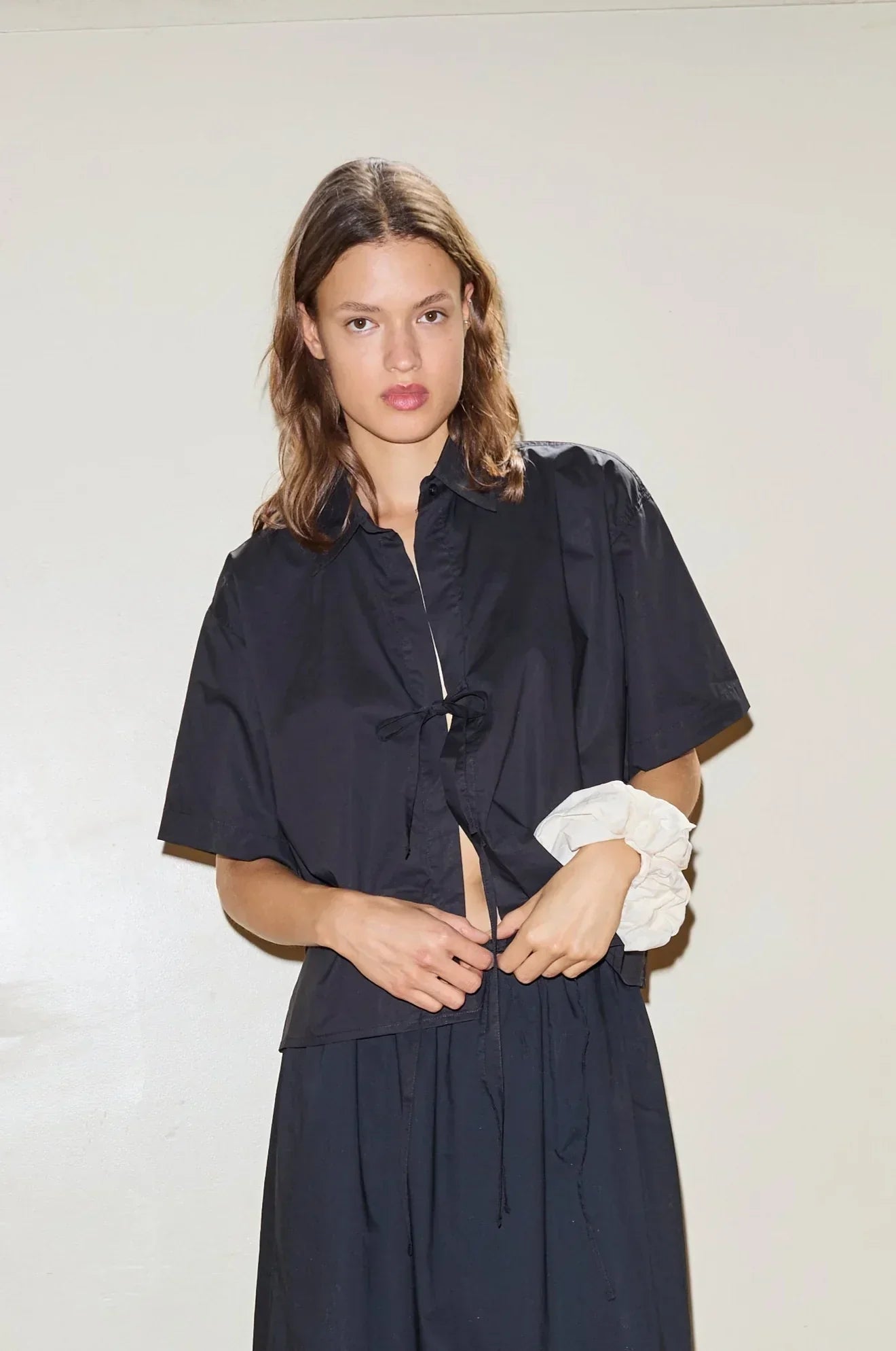 An oversized box fit shirt featuring a double tied front placket for a touch of modern elegance. With a dropped back yoke, dropped shoulders, and back pleats, it offers a beautifully relaxed silhouette and effortless movement.