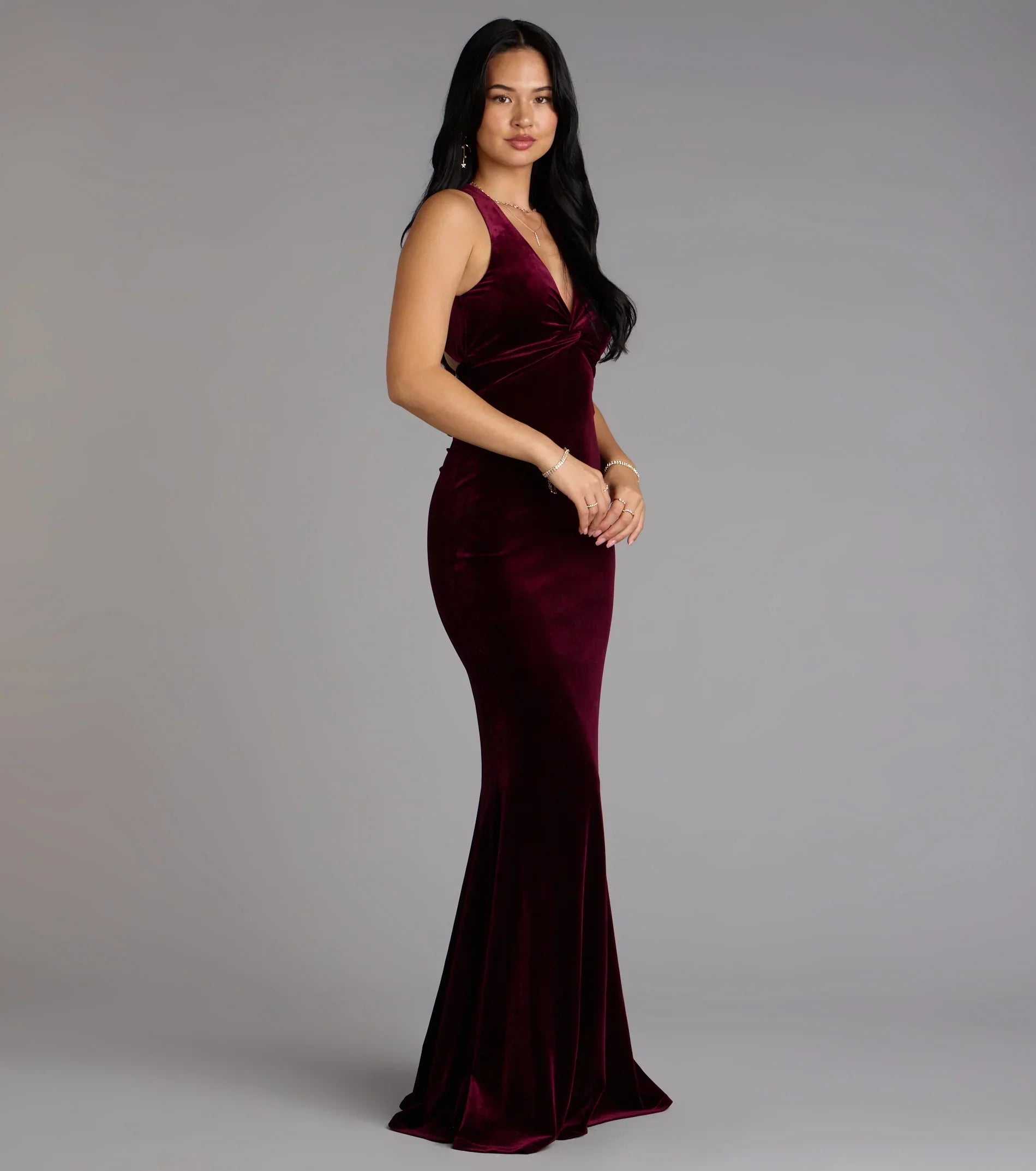 Luxe velvet fabric. Plunging halter neckline. Open tie back design. Mermaid silhouette. Floor length hem. Runs true to size.