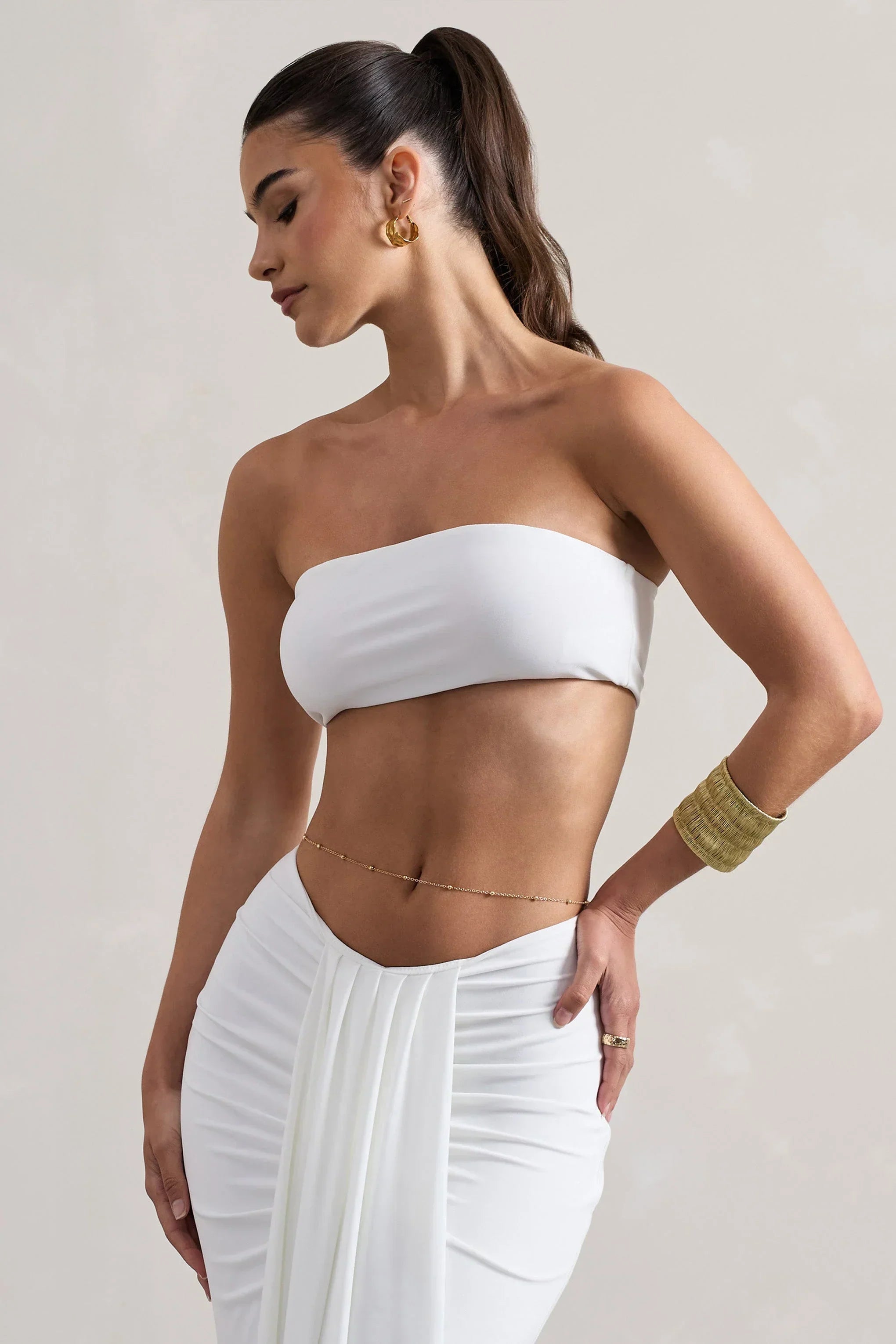 A timeless wardrobe essential, this dual-layered stretch jersey bandeau top transitions effortlessly from day to night. Its cropped silhouette and clean lines offer versatile styling for any warm-weather occasion.