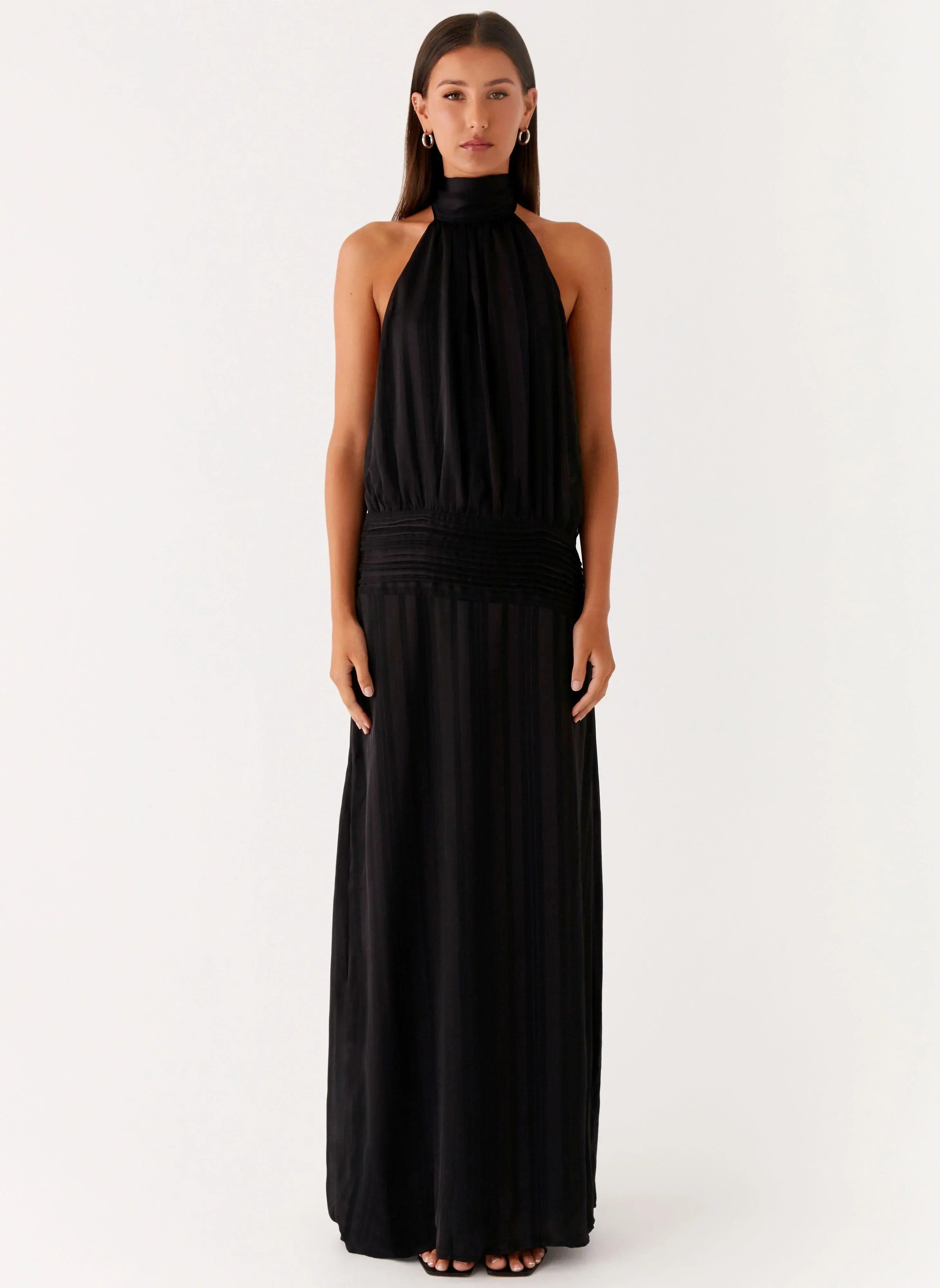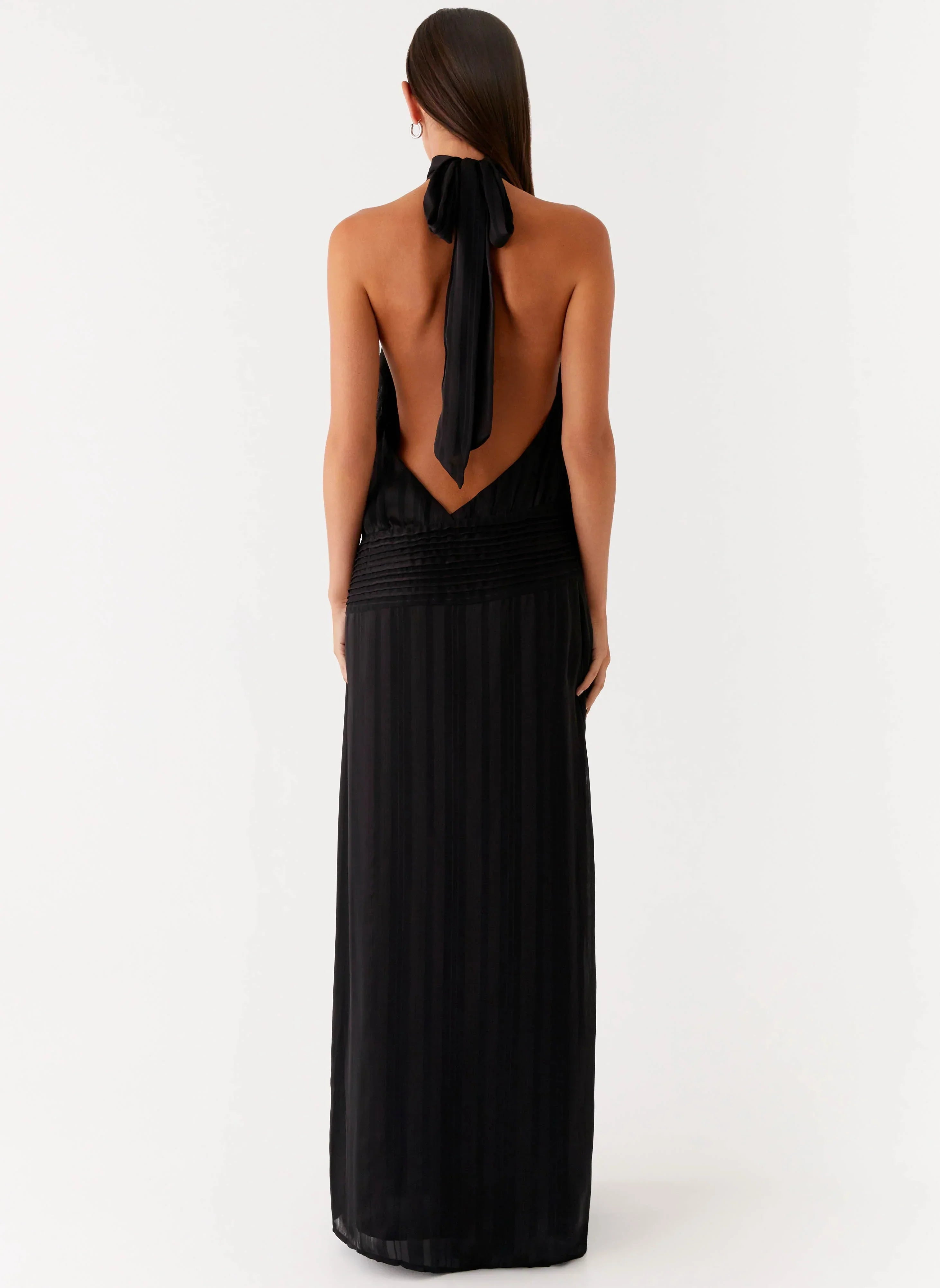 Made for moonlit moments and midnight escapes, this halter neck maxi dress drapes beautifully with its textured fabric and low back design.